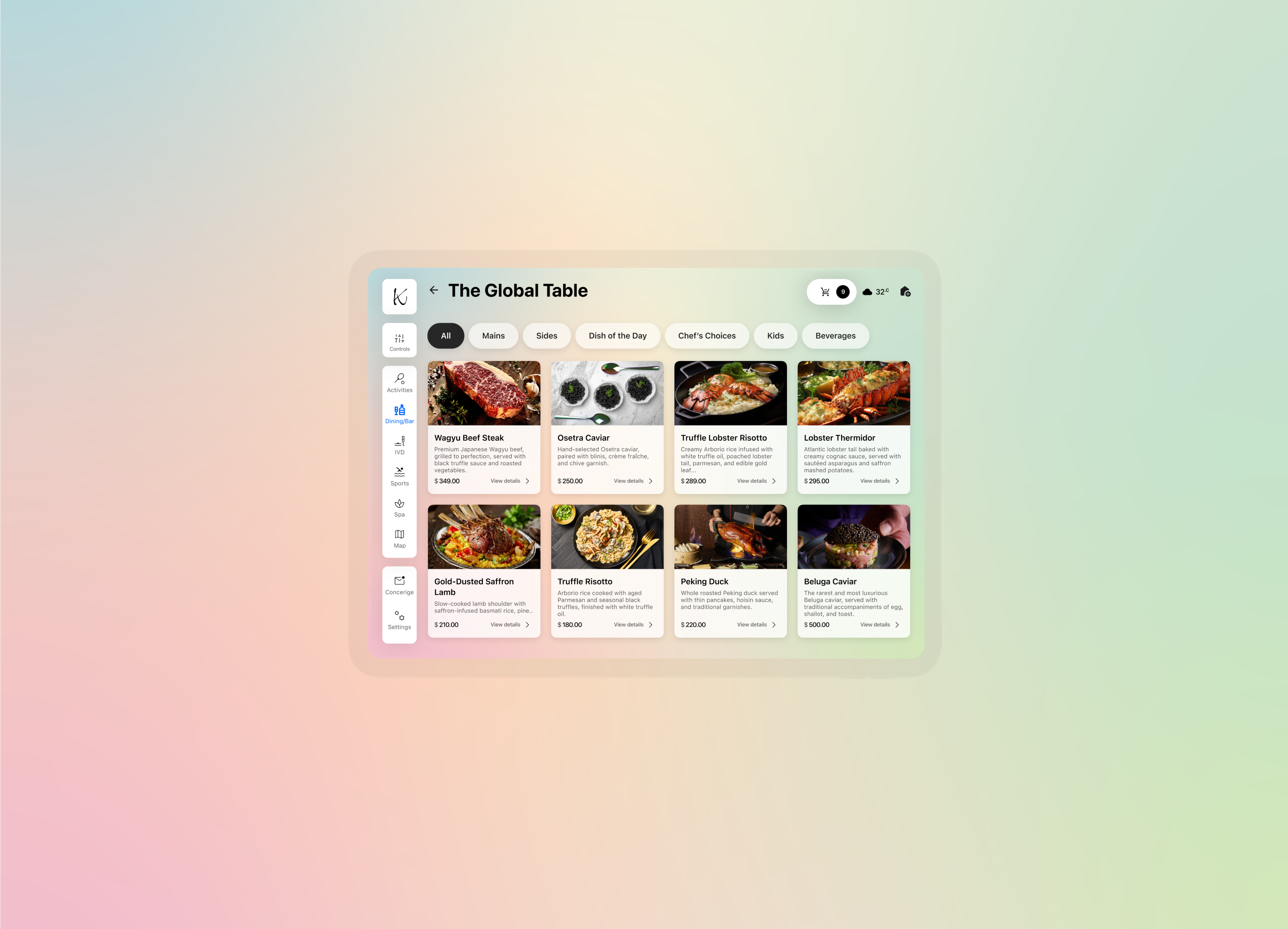 Digital menu for easy browsing and ordering from the hotel's dining options.